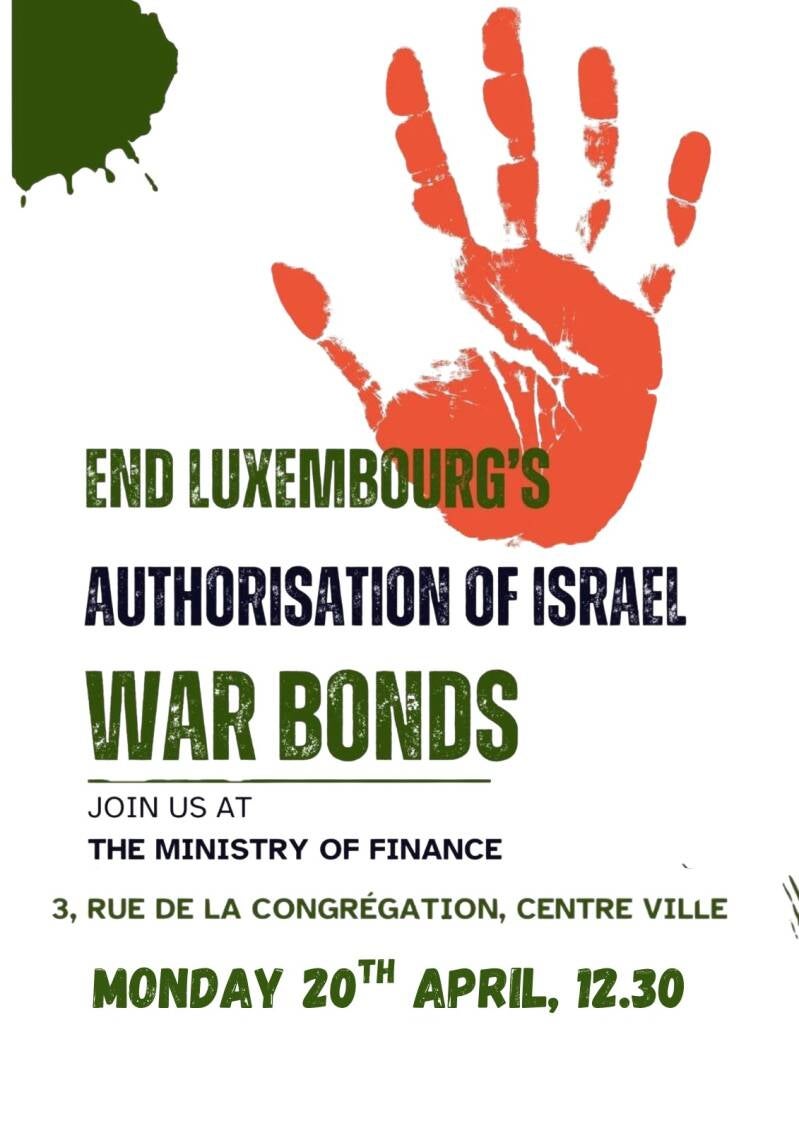 This coming Monday, April 20th 2026, join the protest to End Luxembourg's Authorisation of Israel War Bonds, outside the Finance Ministry at 12.30.