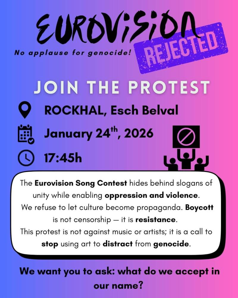 Protest organised by BDS Luxembourg in front of Rockhal in Belval, starting at 17.45. This will be at the occasion of the Luxembourg Song Contest, the local qualifier for the Eurovision which is under international boycott.