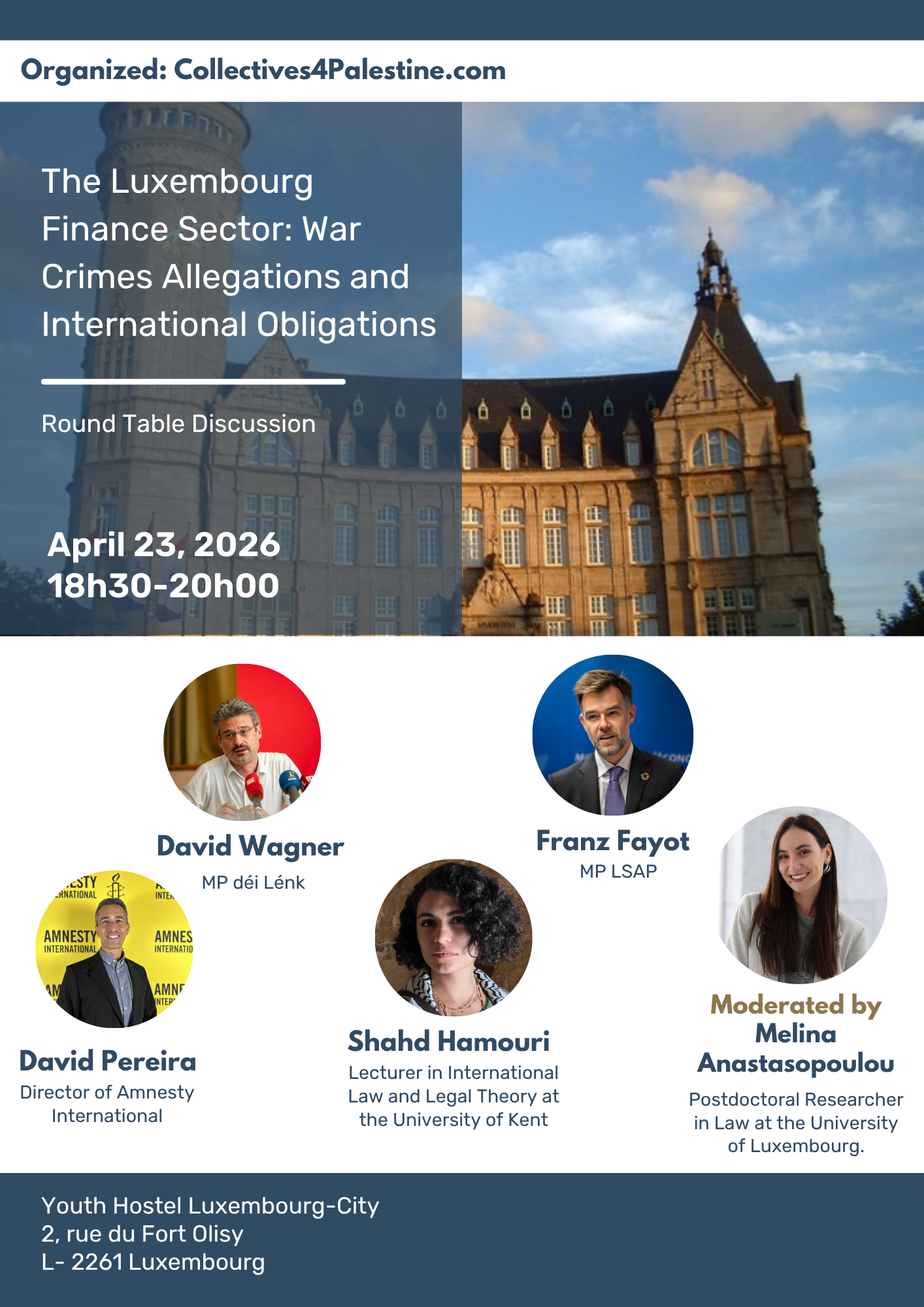 Please join us next Thursday for a round table to discuss the contribution of Luxembourg finance sector in the genocide in Gaza, Lebonan and the unrest in the whole Middle East.
