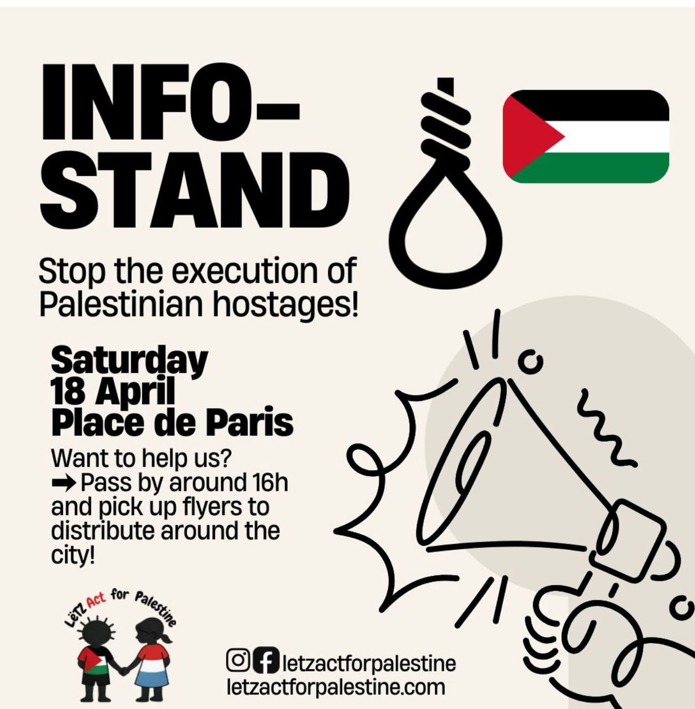 LetzActForPalestine will be at Place de Paris during the global day of action to stop the Israeli plan to execute Palestinian hostages